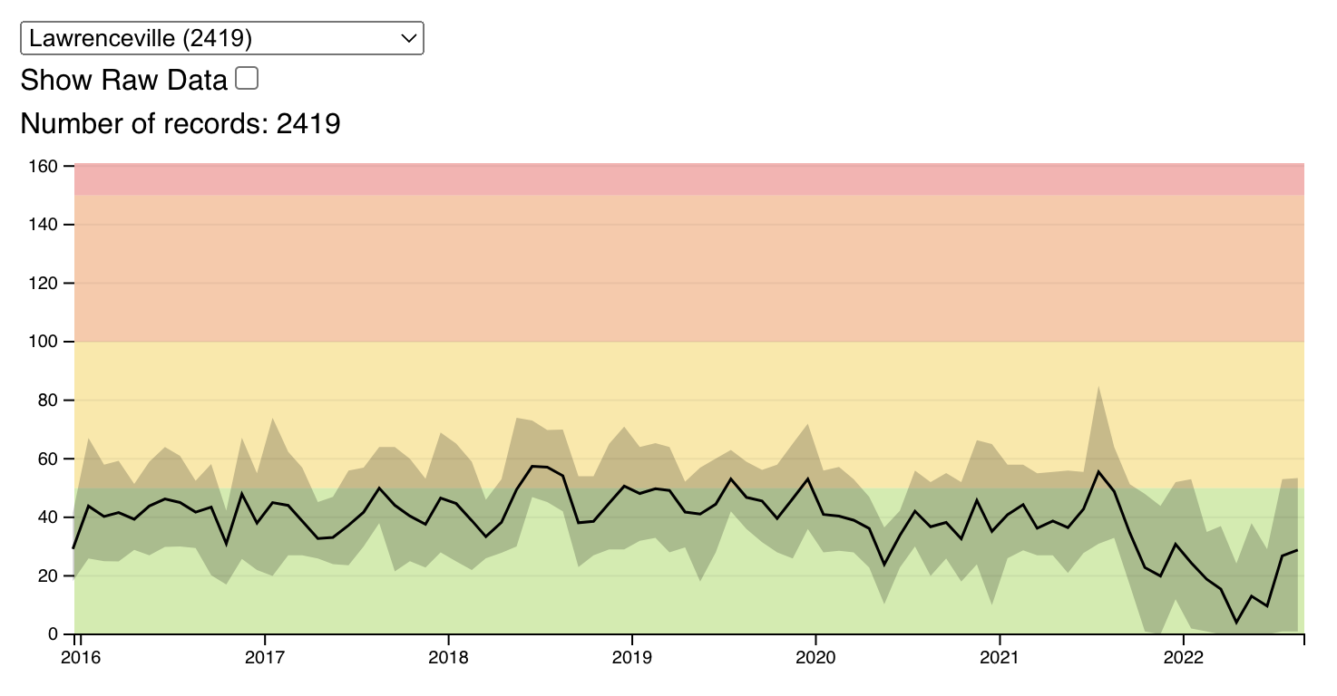 In the first part, create a time-series visualization of the air quality data. The visualization should show the monthly average air quality (AQI) as a line with the inner 80 percentiles (10% to 90%) shown as an area behind the line. Add a dropdown to select the station. If no station is selected, the chart should show the series for all stations. Sort the station names by count. Align the date with the 15th day of the month.