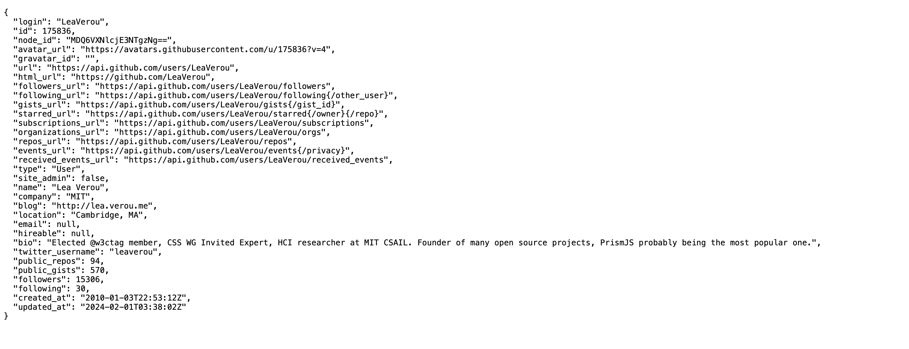 GitHub is one of the few APIs left that provides public data without requiring us to authenticate. We can use the /users/username API endpoint to get public data about a user. Visit https://api.github.com/users/your-username in your browser, replacing your-username with your GitHub username. For example, here is mine: https://api.github.com/users/leaverou.